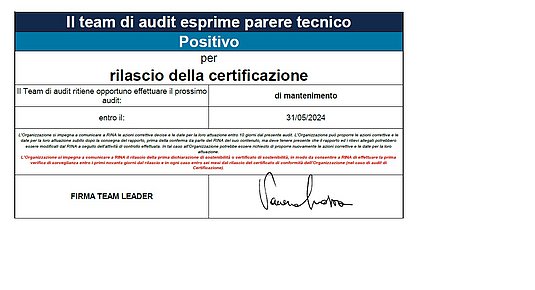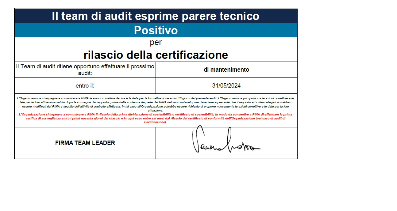 L’audit di certificazione è stato svolto da RINA che non ha rilevato nessun tipo di non conformità.